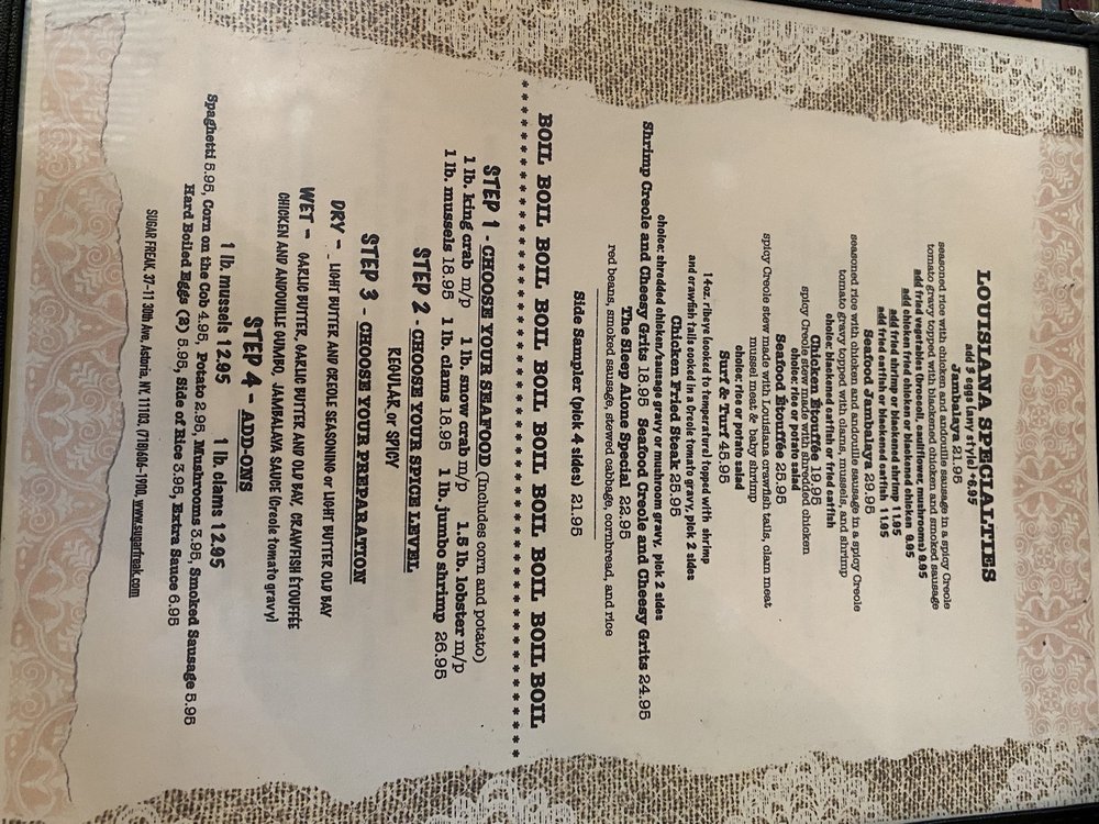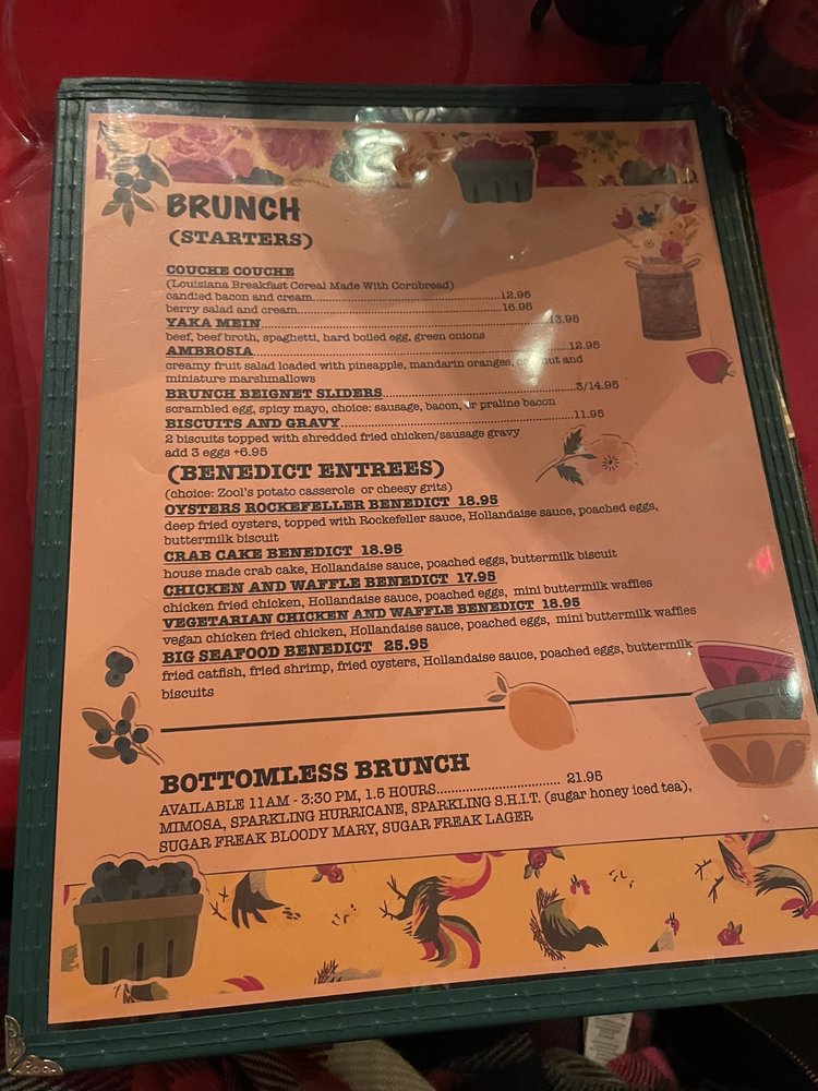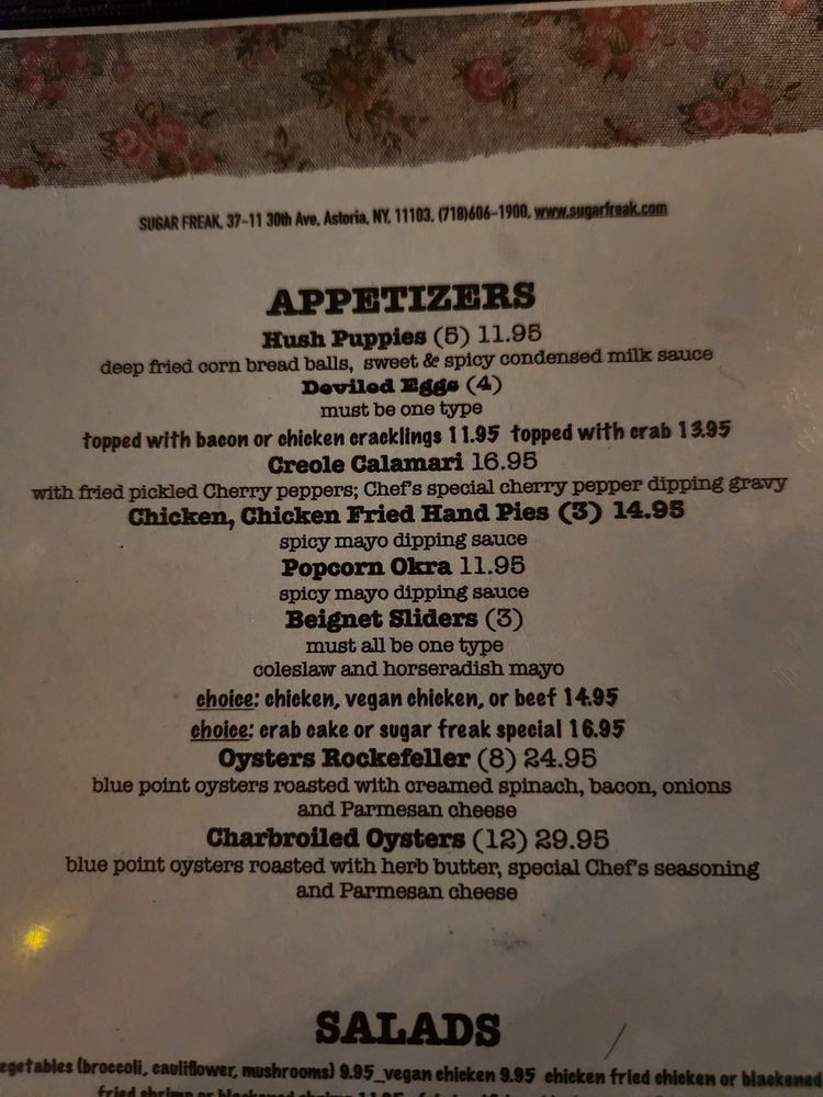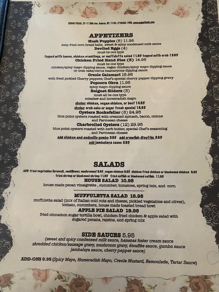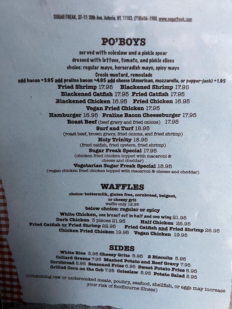 Sugar Freak, located in Astoria, NY, offers a unique New Orleans cuisine experience with a NOLA vibe. The menu boasts a variety of dishes such as Jambalaya, Po'Boys, Chicken & Waffles, and Beignet sliders. Customer reviews rave about the delectable biscuits and gravy, hush puppies, shrimp and grits, and praline bacon. The restaurant's ambiance is described as giving off a NOLA feel, transporting diners to the heart of Louisiana. With attentive service, generous portion sizes, and a cozy setting, Sugar Freak is a must-try for those craving authentic Southern flavors. Don't miss out on the bottomless brunch option for a truly satisfying dining experience.